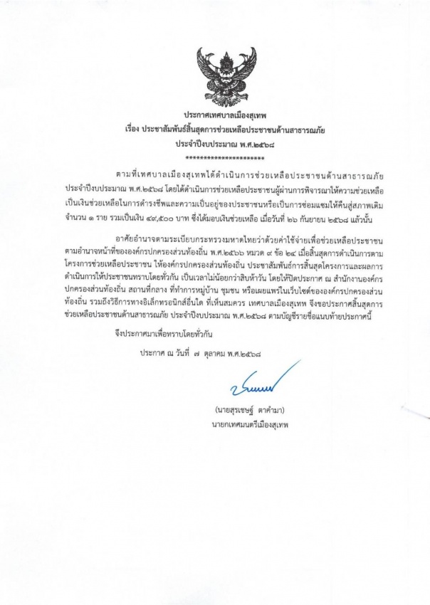 ประกาศเทศบาลเมืองสุเทพ เรื่อง ประชาสัมพันธ์สิ้นสุดการช่วยเหลือประชาชนด้านสาธารณภัย ประจำปีงบประมาณ พ.ศ. 2568
