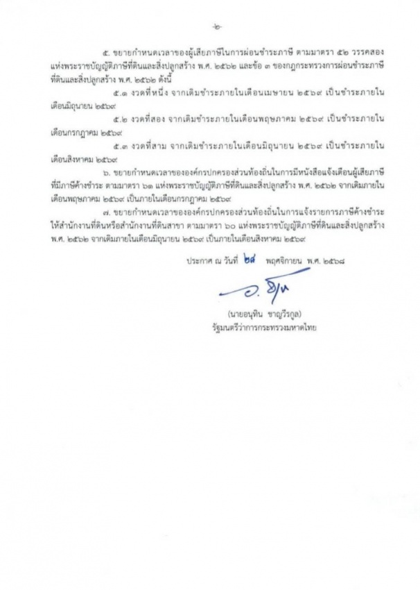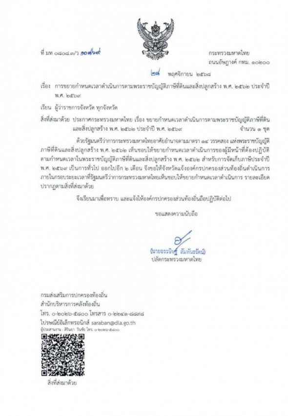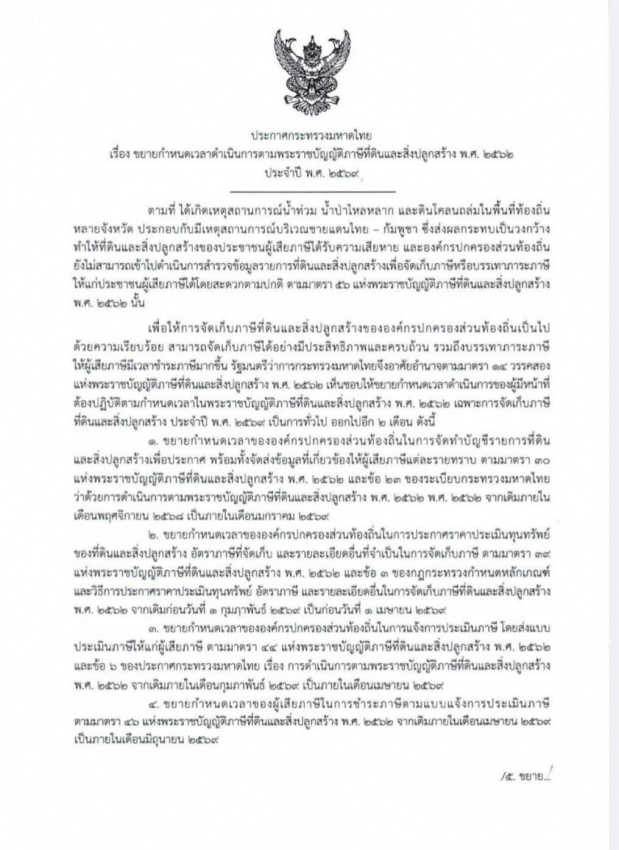 ประกาศกระทรวงมหาดไทย เรื่อง ขยายกำหนดเวลาดำเนินการตามพระราชบัญญัติภาษีที่ดินและสิ่งปลูกสร้าง พ.ศ.2562 ประจำปี พ.ศ. 2569