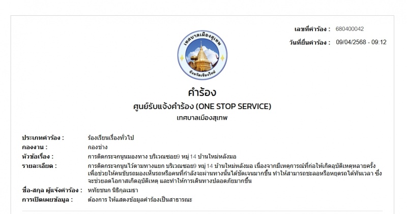 ได้ยื่นคำร้องผ่านศูนย์รับแจ้งคำร้อง (ONE STOP SERVICE) เทศบาลเมืองสุเทพ