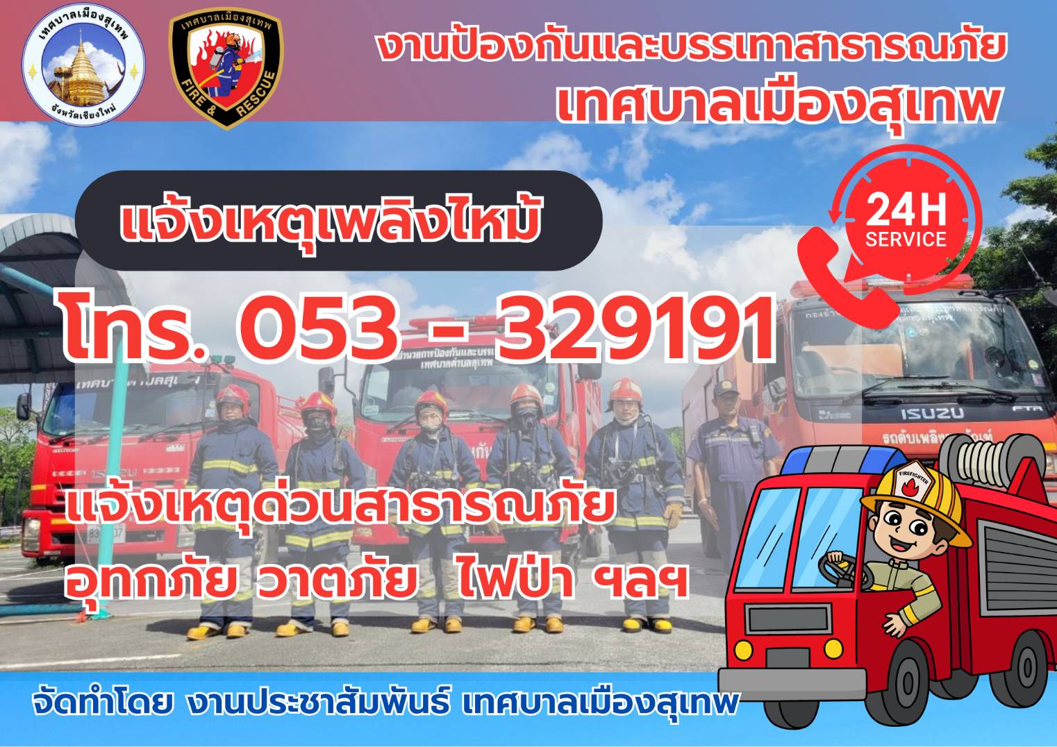 แจ้งเหตุด่วนสาธารณภัย อุทกภัย วาตภัย ไฟป่า ฯลฯ โทร.