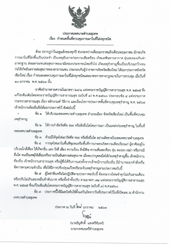 ประกาศเทศบาลตำบลสุเทพ เรื่อง กำหนดพื้นที่ควบคุมการเผาในที่โล่งทุกชนิด
