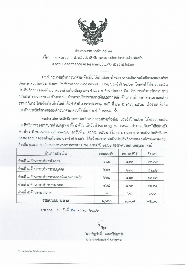 ประกาศเทศบาลตำบลสุเทพ เรื่อง ผลคะแนนการประเมินประสิทธิภาพขององค์กรปกครองส่วนท้องถิ่น (LPA) ประจำปี 2562