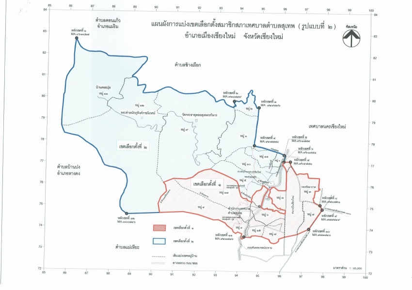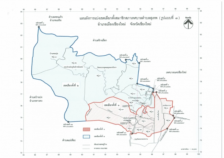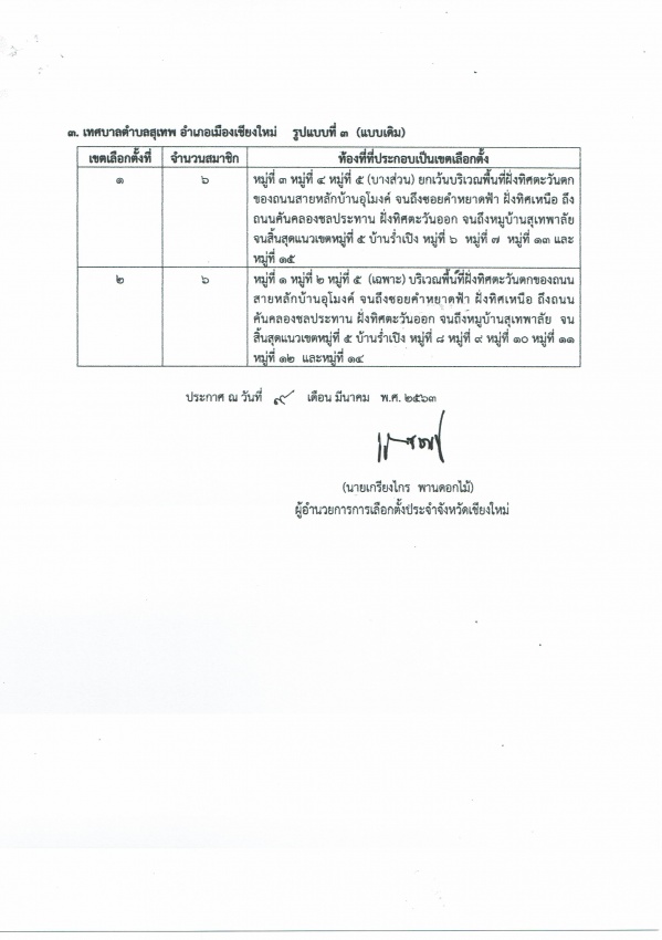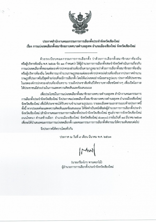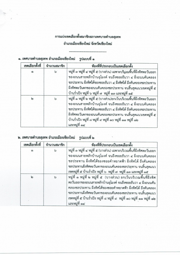 ประกาศสำนักงานคณะกรรมการการเลือกตั้งประจำจังหวัดเชียงใหม่ เรื่อง การแบ่งเขตเลือกตั้งสมาชิกสภาเทศบาลตำบลสุเทพ อำเภอเมืองเชียงใหม่ จังหวัดเชียงใหม่