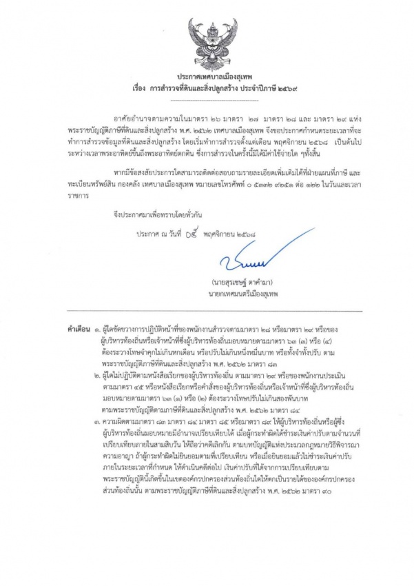 ประกาศเทศบาลเมืองสุเทพ เรื่อง การสำรวจที่ดินและสิ่งปลูกสร้าง ประจำปี 2569