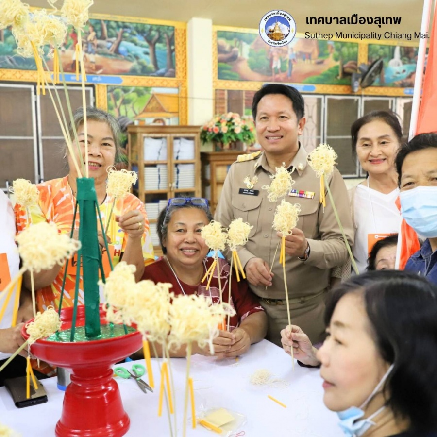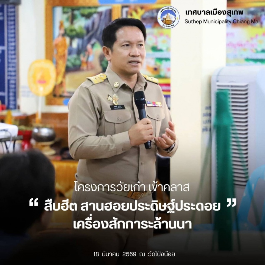 วันนี้ (18 มีนาคม 2569) เทศบาลเมืองสุเทพ โดย นายสุรเชษฐ์ ตาคำมา นายกเทศมนตรีเมืองสุเทพ โดยมี คณะผู้บริหาร ผู้อำนวยการกองสวัสดิการสังคม เจ้าหน้าที่กองสวัสดิการ และผู้สูงอายุเข้าร่วมโครงการสืบสานภูมิปัญญาท้องถิ่น ภายใต้กิจกรรม ?สืบฮีต สานฮอย ประดิดประดอย เครื่องสักการะมงคลล้านนา? เพื่อส่งเสริมให้ผู้สูงอายุได้เรียนรู้และอนุรักษ์ขนบธรรมเนียมประเพณีล้านนา สร้างคุณค่าและความภาคภูมิใจในวัฒนธรรมท้องถิ่น พร้อมทั้งเปิดพื้นที่ให้เกิดการถ่ายทอดองค์ความรู้จากรุ่นสู่รุ่นอย่างยั่งยืน ในโอกาสนี้ นายนพดล คำมูล ให้เกียรติเป็นวิทยากร เพชรราชภัฎ - เพชรล้านนา สาขาภูมิปัญญาท้องถิ่น ด้านช่างฝีมือพื้นบ้าน ณ วัดโป่งน้อย ตำบลสุเทพ อำเภอเมืองเชียงใหม่ จังหวัดเชียงใหม่